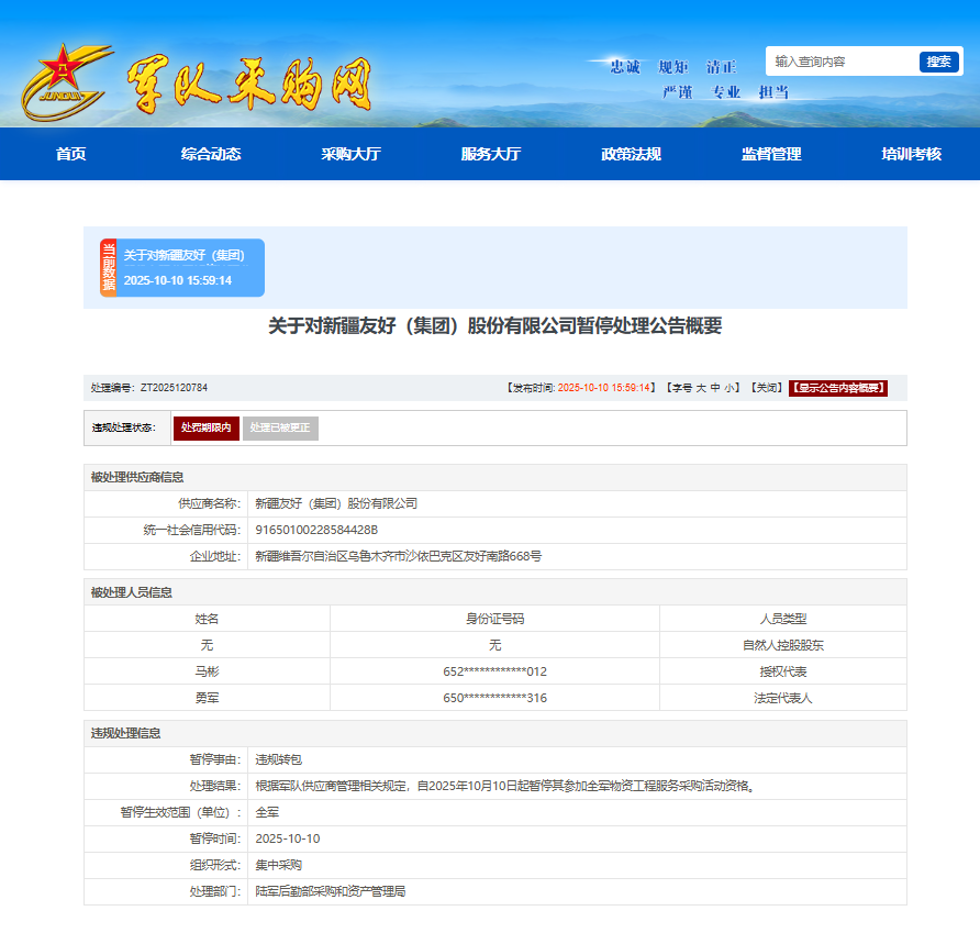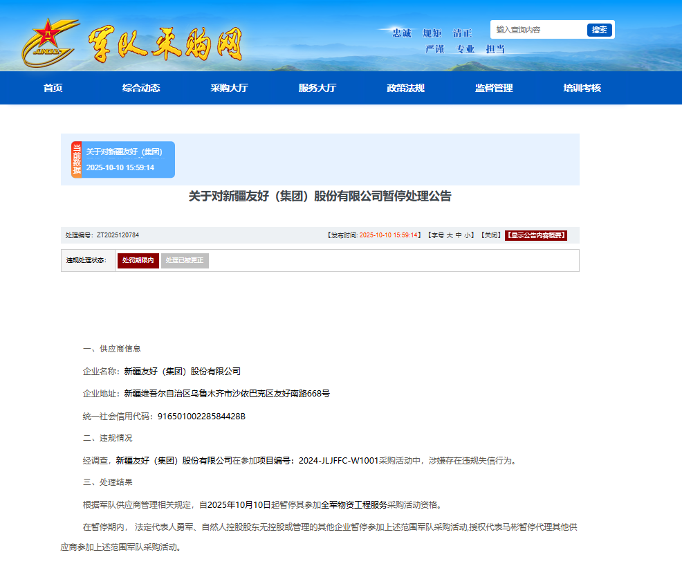 近日,军队采购网发布关于对新疆友好(集团)股份有限公司暂停处理公告。