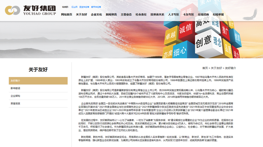 新疆友好(集团)股份有限公司,其前身是乌鲁木齐友好商场,始建于1958年,属老字号国有商业零售企业。1987年经乌鲁木齐市人民政府批准在原址上改扩建,1989年投入营业;1993年改制成立了乌鲁木齐友好商场股份有限公司,1996年股票在上海证券交易所挂牌上市(友好集团 600778.SH)。1998年实施资产战略性重组,与乌鲁木齐市天山百货大楼强强联合,组建了新疆友好(集团)股份有限公司。