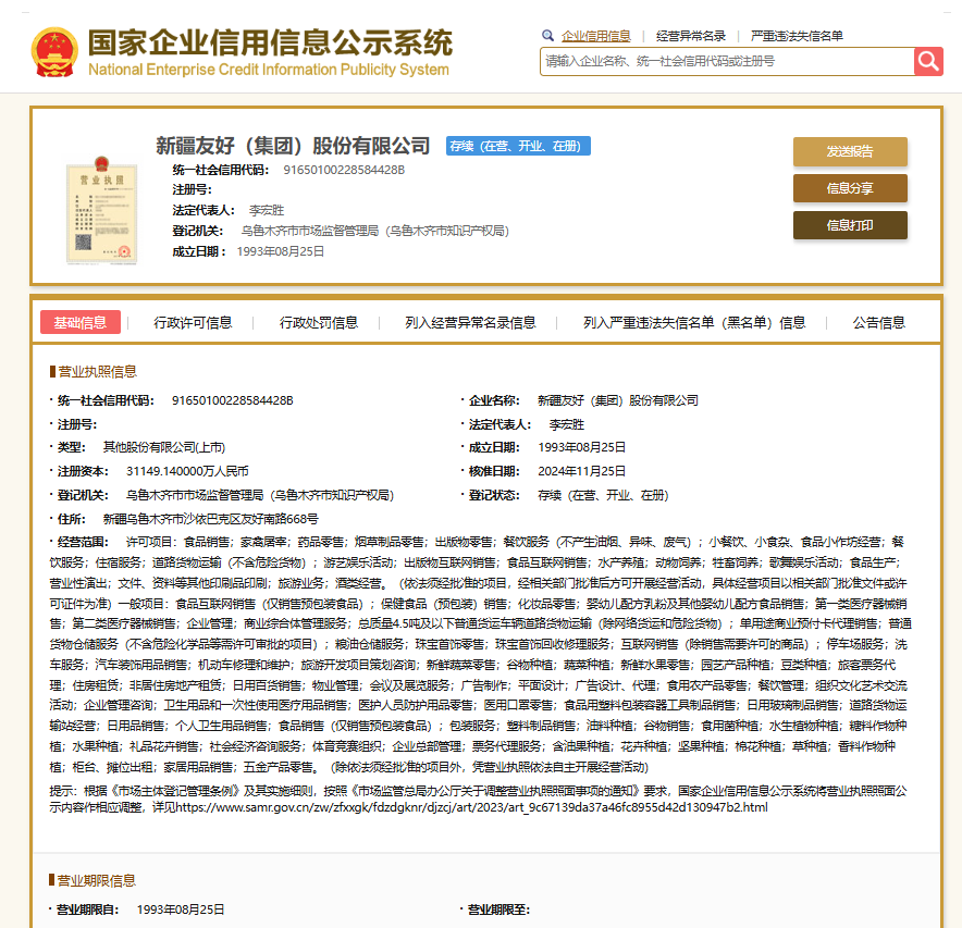 公开信息显示,2024年11月25日,新疆友好(集团)股份有限公司负责人由勇军变更为现任法定代表人李宏胜。