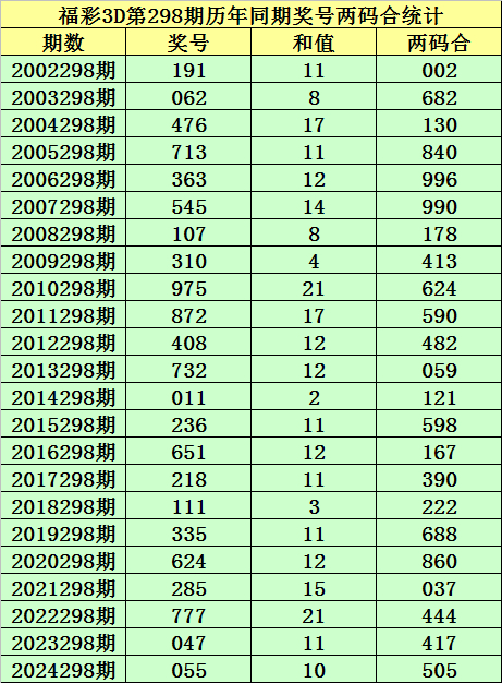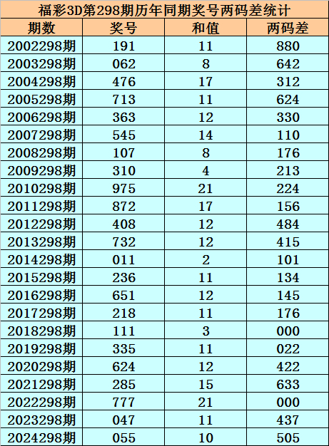 福彩3D第298期,历史上期开出23次奖号,其奖号分别为:191、062、476、713、363、545、107、310、975、872、408、732、011、236、651、218、111、335、624、285、777、047、055,奖号两码合差分别开出: