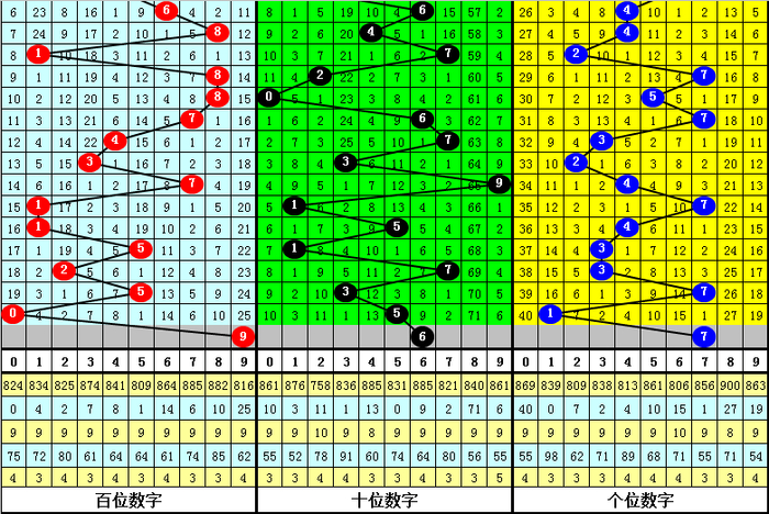 其中两码合0-9开出频次分别为:两码合0开出11次,2、4、8、9开出8次,1开出7次,6开出6次,5开出5次,3、7开出4次,其中两码合012路比为29:19:21,奇偶比为28:41,大小比为31:38;